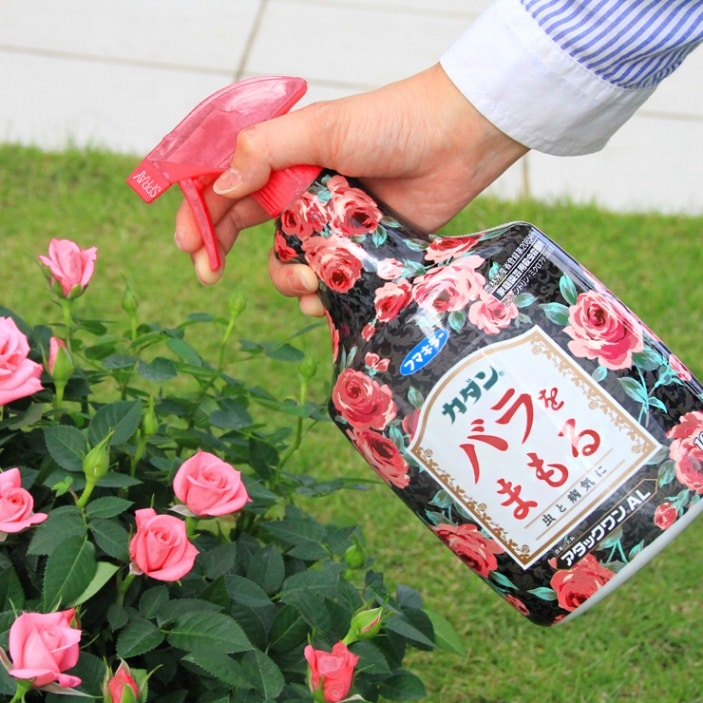 ◎害虫をすばやく退治! 病気の予防と治療に。 薬剤のローテーション使用を行って頂くと、より効果的です。 【病気への効果】 病原菌の有効成分ミクロブタニルはDMI殺菌剤で、細胞膜に影響して菌糸の伸長や胞子の形成を阻害します。 【害虫への効果】 害虫の有効成分ビフェントリンは除虫菊を元に開発されたもので、神経マヒ作用で退治します。 【適用病害虫】 アブラムシ類、ハダニ類、チュウレンジバチ、うどん粉病、黒星病 【特徴】 ノックダウン効果で、バラにつくアブラムシやハダニ、チュウレンジハバチなどの害虫を速効退治。持続性にも優れています。 殺菌成分には、病気の治療と予防効果があります。 かけムラの心配がない浸透移行性で、うどんこ病や黒星病に高い効果を発揮します。 また近くの害虫はもちろん、ノズルを切り替えればパワフルなジェット噴射が可能に。 高所のつるばらにも薬剤がしっかり届きます。